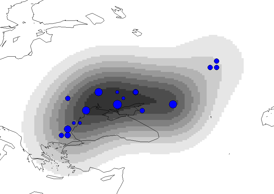 A new paper in PNAS, Direct evidence for positive selection of skin, hair, and eye pigmentation in Europeans during the last 5,000 years, uses ancient DNA to examine the possibility of very recent natural selection in Europeans. In particular, it focuses on eastern Europeans, and roughly a region coterminous with Ukraine ~6000 to ~4000 years ago. The sample seems somewhat biased toward the low end of the age range if you look the supplemental tables. In the paper itself (which is open access) I don’t see a map to get a sense of the distribution of the sites from which the DNA was extracted. So I took the supplemental table and used the latitude and longitude information, as well as the samples from each site, and produced a density map with a bubble plot overlain upon it with specific locations (size of bubble proportional to number of samples at site). Like the earlier ancient DNA from a few European hunter-gatherers one must keep in mind the limitations of the scope of sampling so few to infer about so many. Though the number here is far larger (N >20 or >40 depending on the SNP), the set of markers examined was much smaller, a few pigmentation loci and mtDNA. Nevertheless this is not a trivial geographic example, nor is the time frame, from the Early Eneolithic down to the Bronze Age.