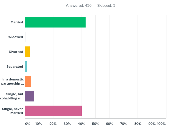 The above demographics are reflected in “relationship status.” Lots of younger people who say “single” (though presumably they are dating).