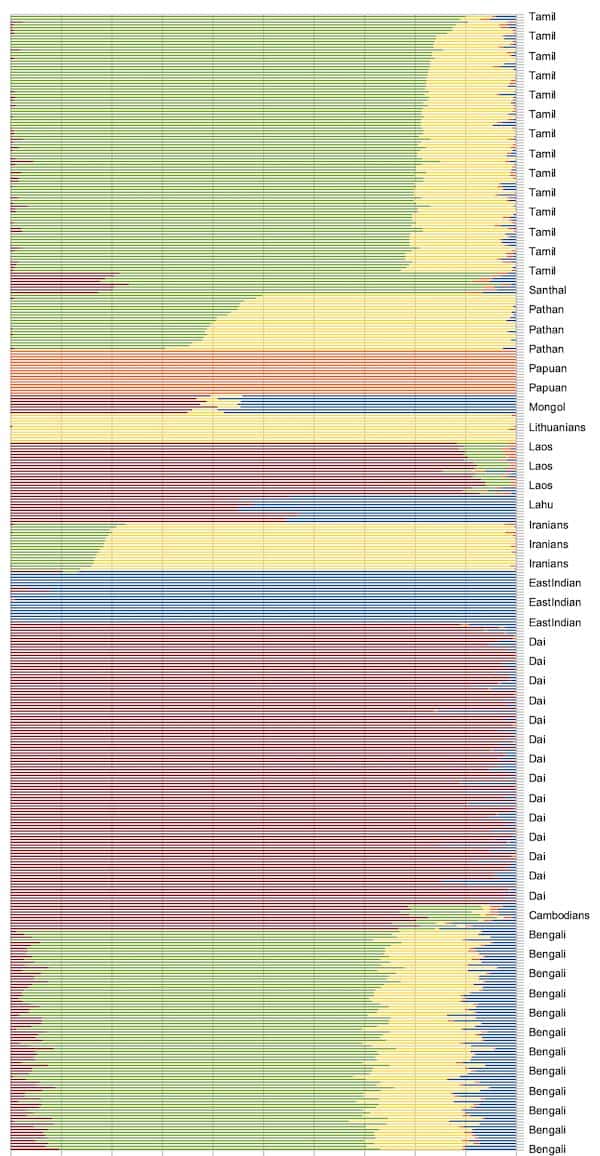 I’ve been looking at the data from the recent Munda paper. Standard stuff, admixture, treemix, and f-statistics.The northern Munda samples were collected in Bangladesh. So I thought: I can test the hypothesis that the East Asian ancestry in Bangladesh is to a large part Santhal. After looking at it every which way, I think that in fact, the Munda may not have ever been very populous in much of northeast India. The Santhal is just not a good donor population to Bengalis, at least not when comparing mixes such as Dai + Tamil.