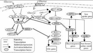 I really like the idea of studying things like cancer and Alzheimer's in things like yeast. Yeast are just so easy to do genetics on. I like things that are reliable and easy to work on (I also like 20 year old Toyotas). Okay, just file the following away... I may not even come back to it today: Despite the canonized pathways of metabolism in eukaryotes, notably yeast, there is still quite a bit about metabolism that is unknown. Metabolism is important for lots of things in biology, since biological organisms have energy requirements, but one particularly interesting aspect of metabolism for humans is how it changes in cancerous tissue. One of the hallmarks of tumor cells is the excessive metabolism of glucose, often the result of mutations that have left the glycolysis machinery running unattended. There. Now onto another topic: transcriptional response to environmental changes in yeast. Organisms, even unicellular ones, have to respond to their environment. They can do this in the short term by leveraging the proteins that comprise the cell against the problem (think heat shock proteins refolding proteins, for example). But if the stimulus is long-lasting, then the cell too needs a long-lasting response, and we generally start thinking about transcription of genes to make new RNA to, in turn, make new proteins to come to the aid of the cell in its hour(s) of need. But the details of these responses have not been particularly well-studied, so today I review an attempt to perturb yeast cultures while monitoring their transcriptional and metabolic responses (pdf) that was published by the Botstein lab at Princeton University's Lewis-Sigler Institute for Integrative Genomics in collaboration with Michal Ronen, a graduate student-turned post-doc at Stanford. Botstein has long been tangled in the development of microarray technology and interpretation, so it's no surprise that this study teams the microarray with an old microbiology tool, the chemostat, to profile the transcriptional response of yeast to small doses of glucose. The chemostat, for those unfamiliar, is a device that allows the steady-state growth of a microbial culture by continually adding nutrients and removing excess culture and byproduct. On a side note, the chemostat was invented by nuclear physicist Leo Szilard, Einstein's coauthor of the letter that kicked off the Manhattan Project (man, those guys all had night jobs!). Anyway, the idea here is to grow yeast in a chemostat, and then give them a tiny little glob of glucose to metabolize, and see how they respond transcriptionally and metabolically. The transcriptional measurement was done by microarray, and the metabolic assay was as simple as looking at how long it took for the glucose to "go away" and the ethanol to show up. I say "go away" because there are two obvious ways for it to do so: 1) glucose could be dissipating through the chemostat, or 2) it could be metabolized by the yeast. Since it "goes away" much faster if there are yeast in the chemostat, and since ethanol shows up on the chemostat if yeast are there, it's safe to assume that the yeast are metabolizing the glucose to ethanol, as yeast are wont to do. The interesting data, of course, is in the transcriptional response. The glucose doses came in one of two sizes: really small, and small. Both doses were too small to allow the cells to change in number (division) or size (growth without division), yet over the course of the next 3 hours (about one yeast cell cycle), 25% of genes changed expression at least 2 fold. Within minutes, there were dramatic expression differences, exhibiting the transcriptional response to the new carbon source, and over the remainder of the 3 hours measured, the RNA levels returned to their initial state in different modes. Most of the genes behaved in a "burst response," meaning that their transcripts dropped dramatically, then climbed back to initial state levels. These included the galactose metabolism genes, TCA cycle genes, and interestingly, ribosomal genes. The glucose metabolism genes, including both glycolysis and gluconeogenesis, both showed a "lasting response," though in opposite directions (glycolysis goes up and falls off slowly, gluconeogeneis goes down and comes up slowly). A couple of genes, including the hexokinase genes, exhibited a bidirectional response, first dipping quickly, and then peaking well above baseline. These guys are known to work in a cross-regulatory circuit with MIG1 and RGT1. MIG1 is responsible for repressing the expression of gluconeogenesis and galactose genes, and is upregulated by glucose presence in the cell (all this is outlined in the diagram I’ve taken from pg. 391 of the article and posted below). RGT1, meanwhile, represses the hexokinase transporter, which is responsible for importing glucose into the cell. The point is, these genes are in a repression-oscillator circuit, and thus have a bidirectional response that generates a smooth combined effect for regulating the switch from glucose to alternative carbon sources. ![]() They also quantified the iron chelators, but I don't really see the significance, and the signal was much shakier, so I'll say only that about them. It's interesting to think about the transcript levels that fell quickly, as I went into this paper thinking that it was going to be about transcription, not degradation. The authors mention in the discussion that the half-life of a glycolysis RNA 3 times longer in a glucose-rich culture, and that begs for more investigation (since we also don't know jack about RNA degradation)[Coffee Mug note: we know a little about RNA degradation]. Using all this data on the levels of the RNA rise and fall of each group of genes, and knowing a bit about how each gene in the system regulates the system, the authors then construct a couple of basic differential equations to model the transcription factor activity (TFA) of some of the genes. It's important to realize that TFA is 